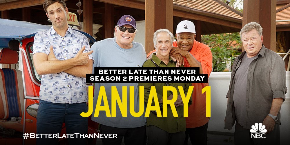 A guide listing the titles AND air dates for episodes of the TV series Better Late Than Never. For US airdates of a foreign show click The Futon Critic. A reality series on the NBC television network Better Late Than Never follows Henry Winkler William Shatner Terry Bradshaw and George Foreman as they travel the world with both help.